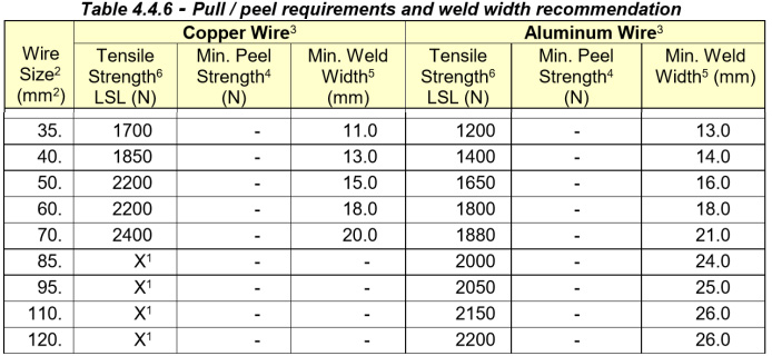 電池的正極材料為鋁,所以檢測(cè)線基本為銅線焊接到鋁片上,對(duì)于這樣的應(yīng)用可以認(rèn)為為鋁銅連接,拉力撕拉力應(yīng)參照鋁線焊接,按USCAR38-1標(biāo)準(zhǔn),0.22﹑0.35 mm2線的標(biāo)準(zhǔn)是缺失的。具體可以參照我司楚鑫sonictech的企業(yè)標(biāo)準(zhǔn)。