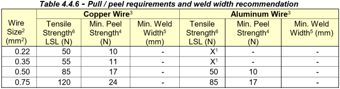 此表格為USCAR38-1拉力撕拉力標(biāo)準(zhǔn)。實(shí)際生產(chǎn)時(shí),拉力應(yīng)達(dá)到該標(biāo)準(zhǔn)的2倍以上,底線為該標(biāo)準(zhǔn)的1.5倍。
